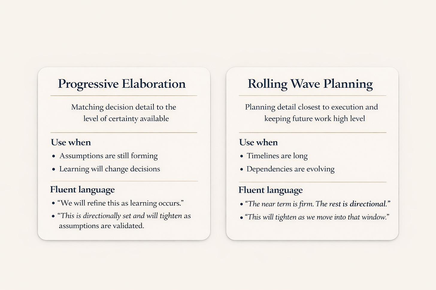 This is where progressive elaboration and rolling wave planning matter. Not as textbook concepts, but as everyday thinking tools that let you move forward without overcommitting, overexplaining, or backing yourself into a corner.